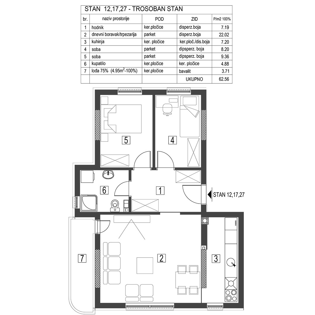 Br Prostorija Kvadratura 1 Predsoblje 7.19 m2 2 Dnevna soba/trpezarija 22.02 m2 3 Kuhinja 7.20 m2 4 Soba 8.20 m2 5 Soba 9.36 m2 6 Kupatilo 4.88 m2 7 Lođa 3.71 m2   Ukupno 62.56 m2   ...Pročitajte više